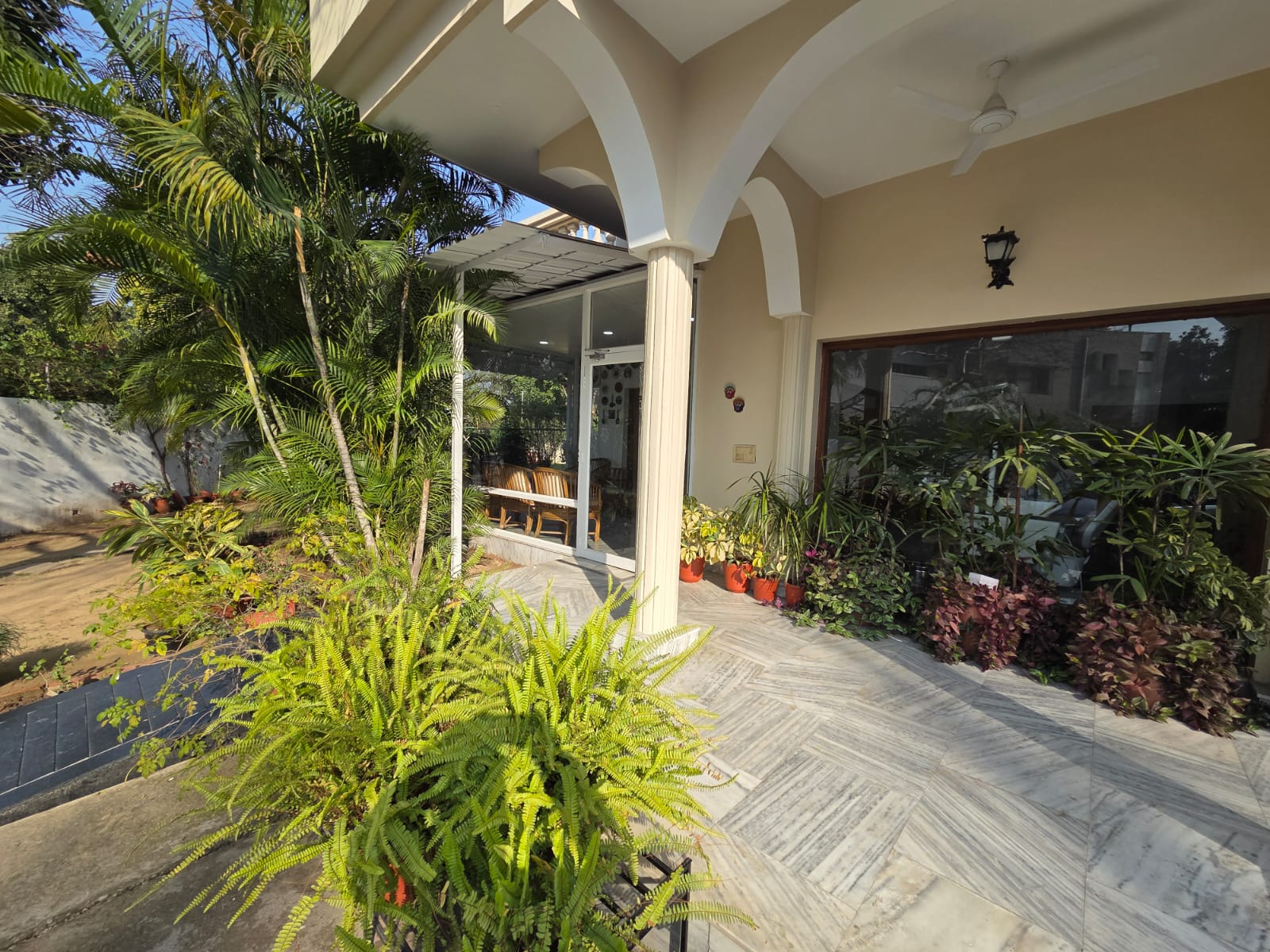 Welcoming entrance surrounded by greenery.